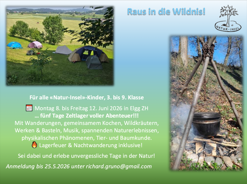 - Vor- und Nachmittag: „NATUR-INSEL“… - Leben und Lernen in der Natur / Projekte / Soziales Lernen voneinander / Kochen (auch mal über dem Feuer) + Abwaschen / Projekte, Hobbys (aus allen Bereichen: Musik, Werken, Basteln, Sport, Berufe etc.)